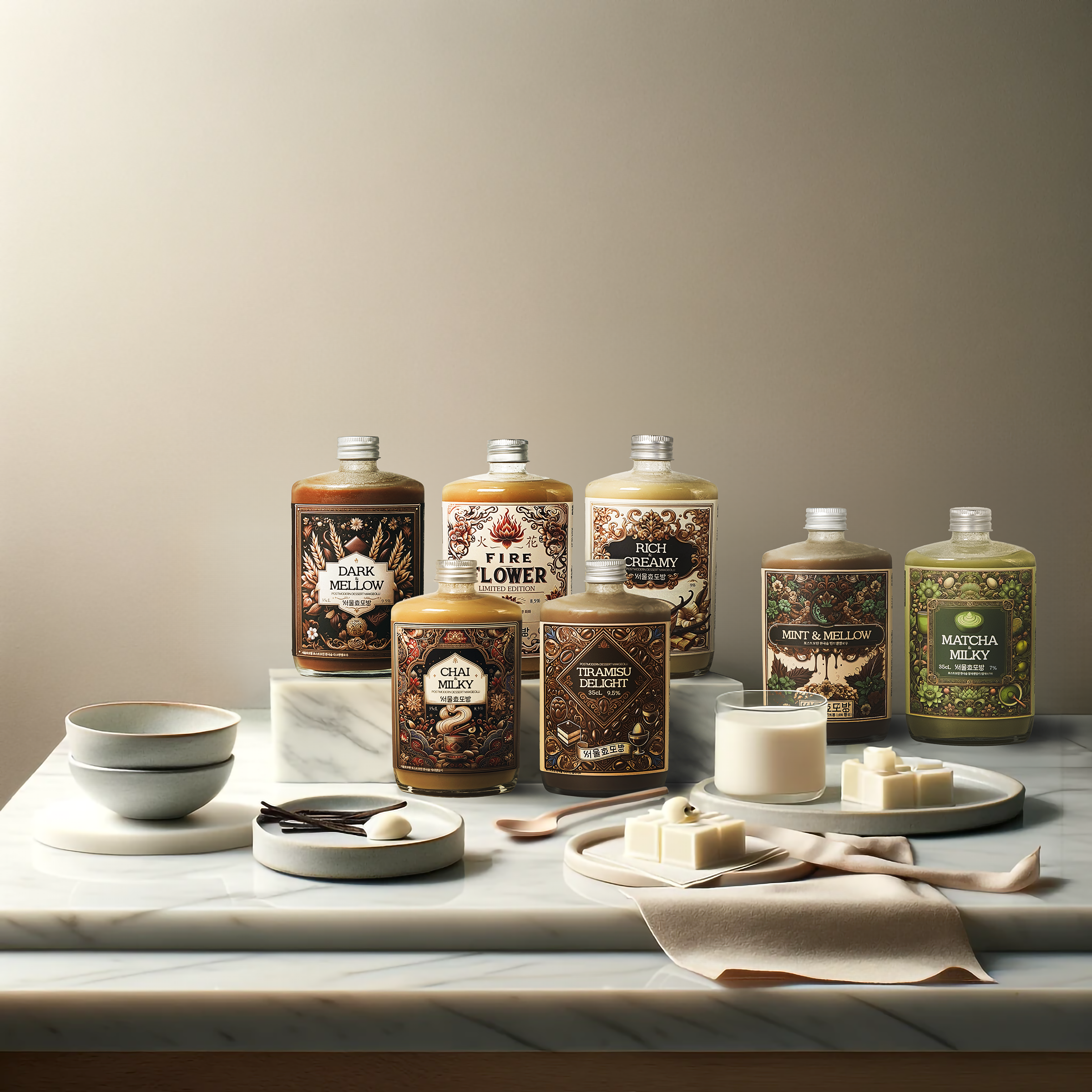 デザートシリーズは、ベーキングに触発された新しい形の韓国酒です。他の酒類と異なり、韓国の濁酒はクリーム、ミルク、卵などから得られる豊富な脂肪とたんぱく質を酒に溶かし込むことができます。1年以上の研究の末、このような韓国酒だけが使用できる独特の材料と技術を基に、ベーキングの文法を忠実に反映した、真の新しい伝統酒が誕生しました。